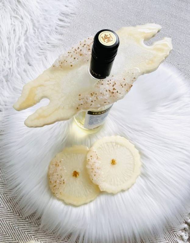 Wine Butler Handmade of Resin Cream & Gold Wine Holder with Set of 2 Wine Glass Coasters