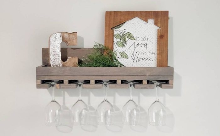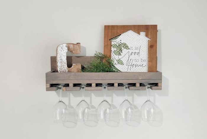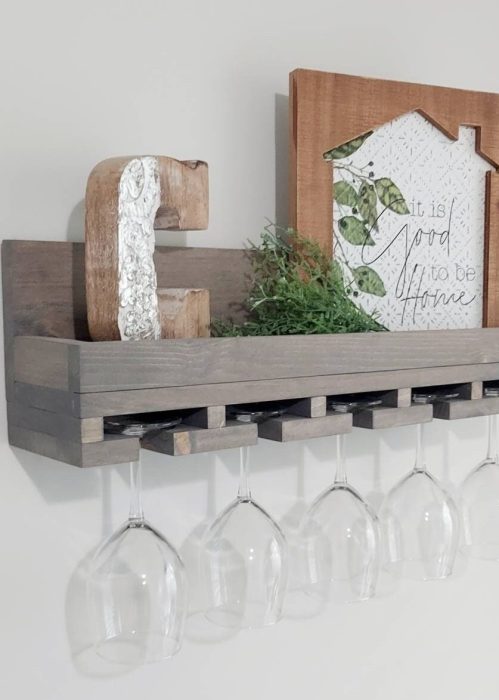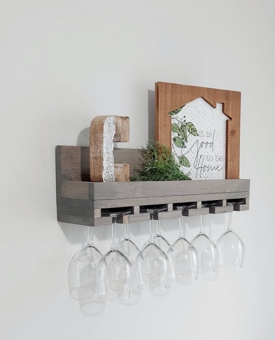 This wooden wine glass holder is a beautiful and functional way to store and display your stemware. Perfect for small spaces! You can decorate your shelf with your favorite decor or use it to store bottles of wine and bar accessories.