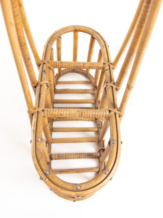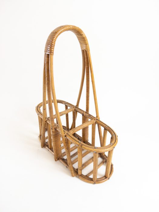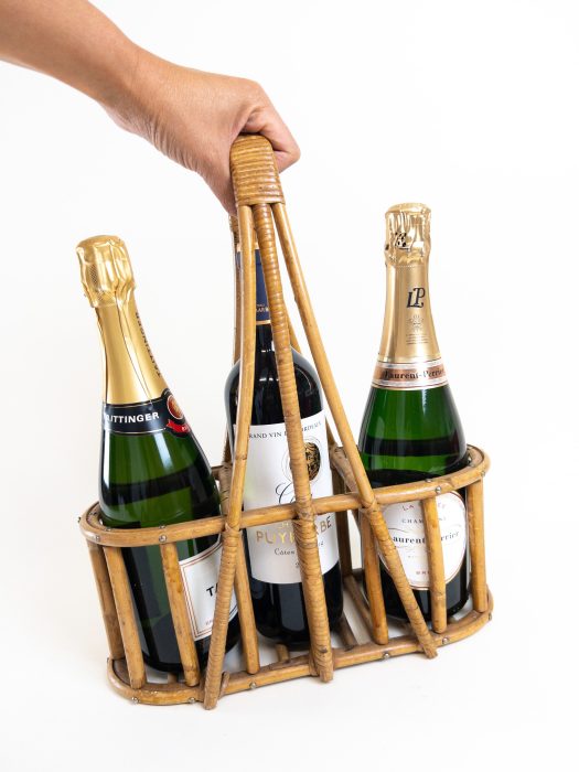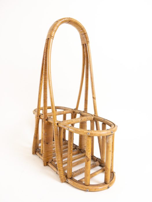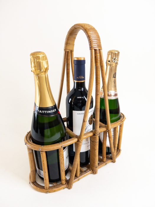 A lovely wine and champagne bottle carrier. This carrier is made of bamboo and rattan with a wide comfortable handle at the top. The side holders are big enough for champagne bottles and the centre holder can hold your standard wine bottle. This holder is great as a decorative piece or can be used as a charming way to carry your wine bottles to a garden party. Please always support the base of the holder as this is a vintage piece and is not as strong as when new.