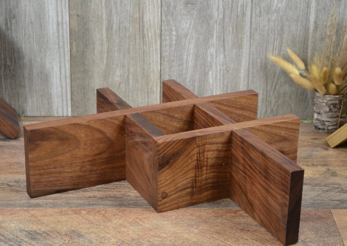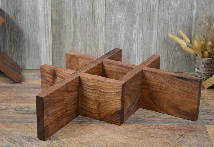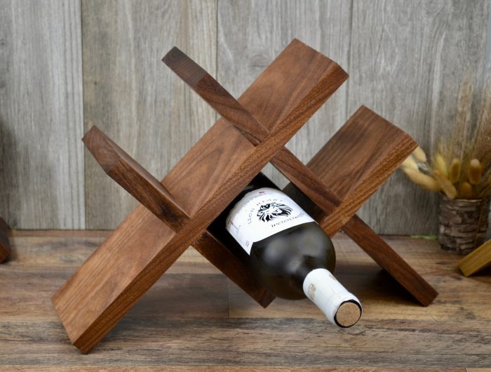 Rustic style wine rack made from black walnut wood. It has a food grade finish. It holds four bottles of wine. It measures 15″ wide and 10 1/2″ tall. It’s four inches deep.