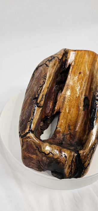 This wine stand is made from a piece of cedar trunk that has been carved into a wine bottle holder shape. The fractal pattern can be added to the wine stand using a technique called Lichtenberg burning (for extra $50). Lichtenberg burning is a process that uses electricity to create a branching pattern of lines on wood. The pattern is created when the electricity jumps between two points on the wood, and the path of the electricity determines the shape of the pattern.