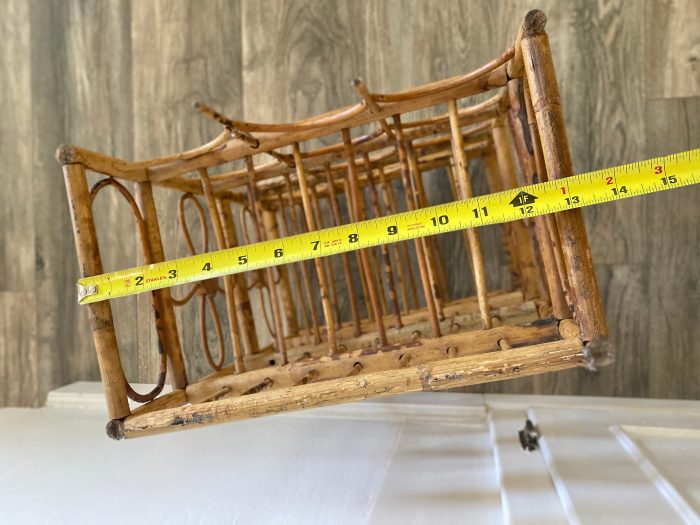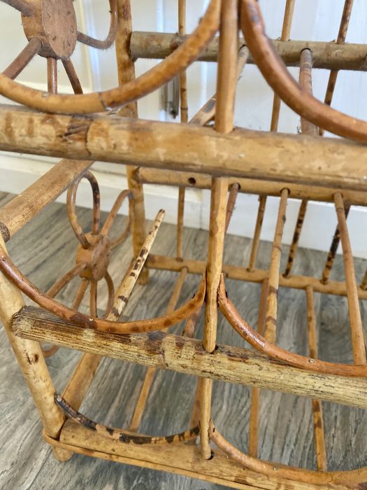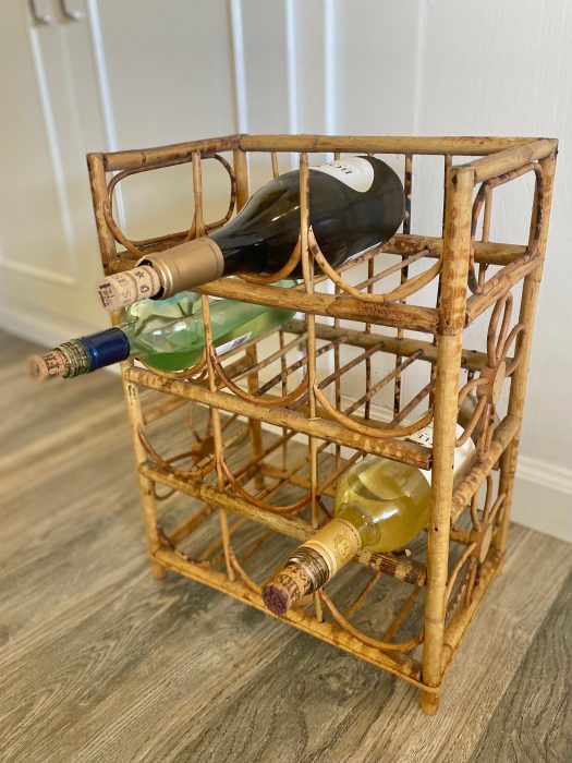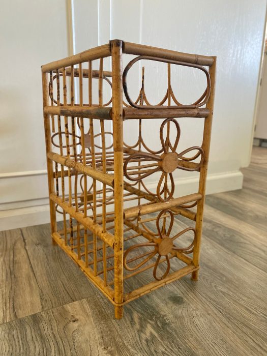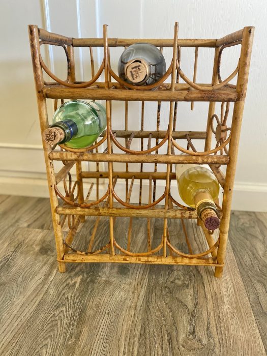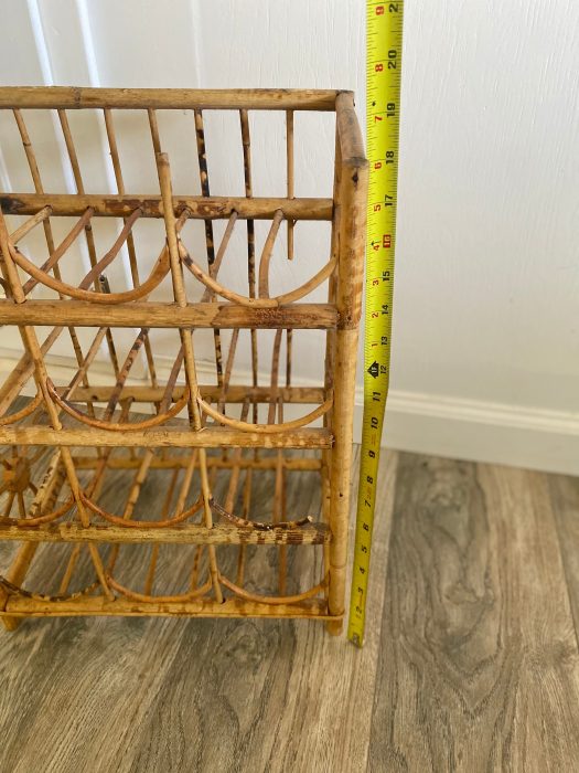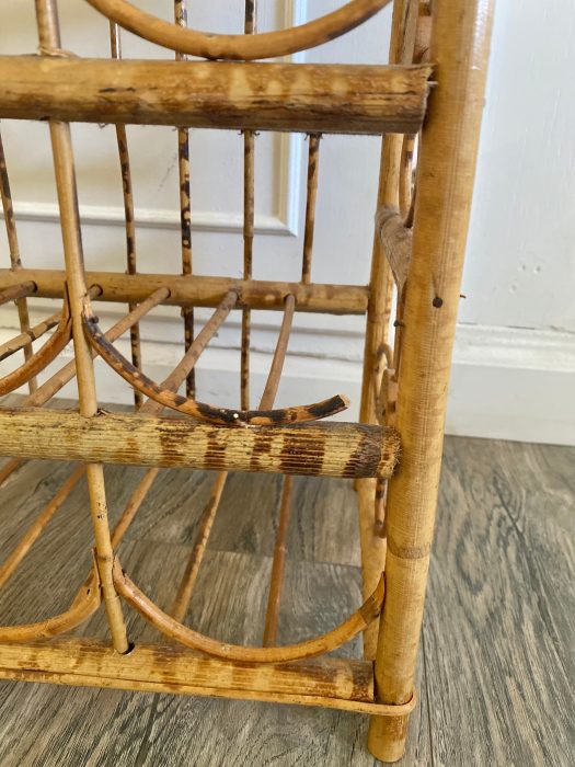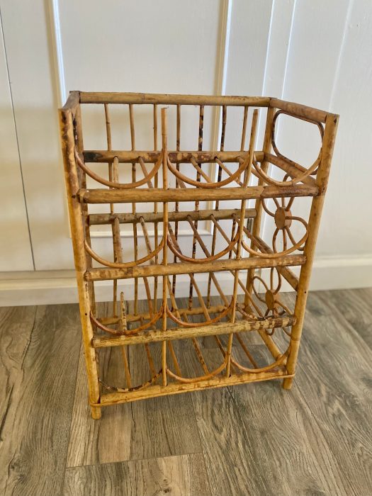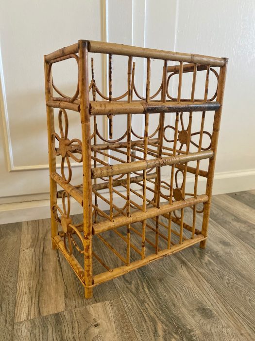 Cute boho tiki wine rack. Holds 12 bottles. Good vintage condition. Some areas have missing bamboo from where it has partially broke off.
