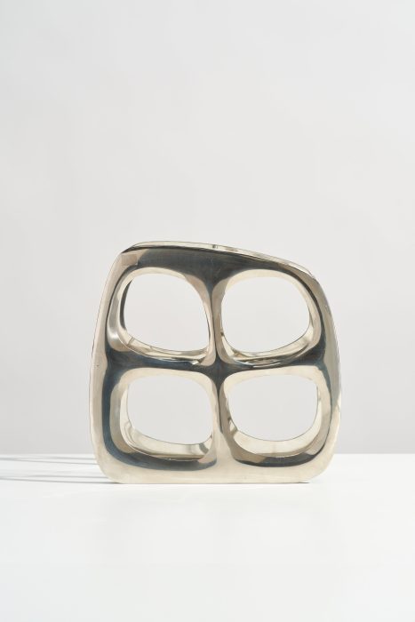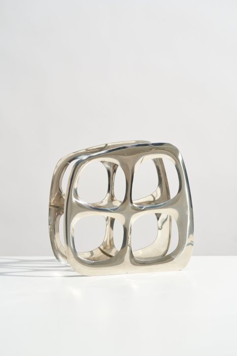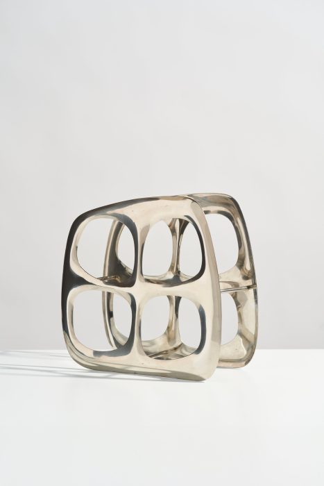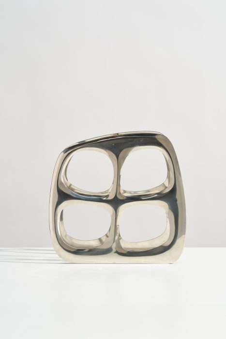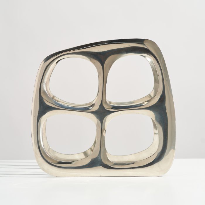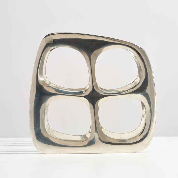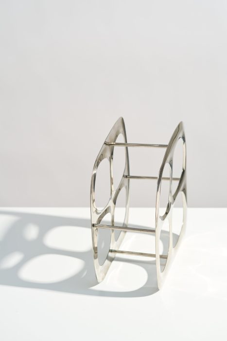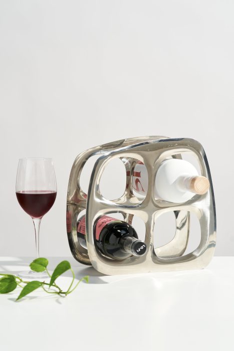 This modernist wine bottle rack would look perfect styled on your kitchen countertop or credenza! Made of cast aluminum, this wine holder has a beautiful, organic shape and can hold up to four bottles. The reflective silver chrome color works well in many design styles.