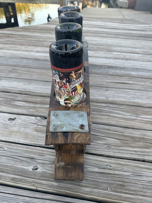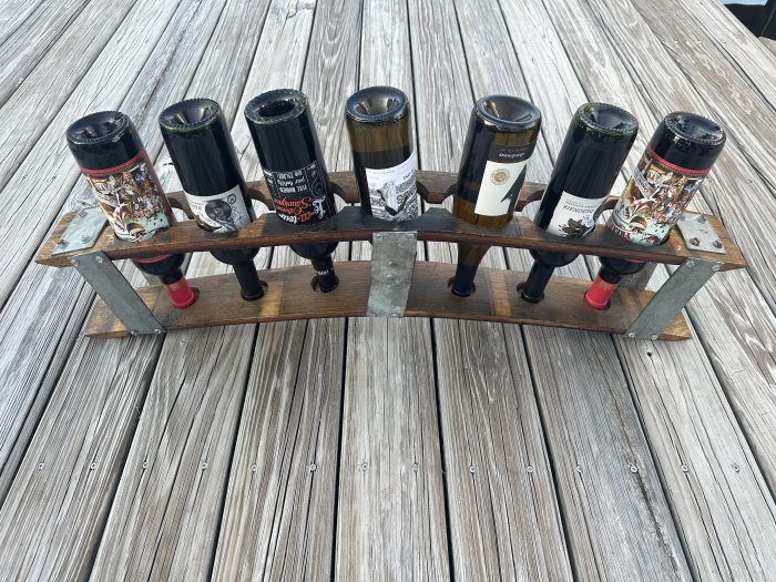 Upcylced wine rack made from retired wine barrels, even the metal. This wine rack easily holds 7 bottles of wine or similar shaped bottles.