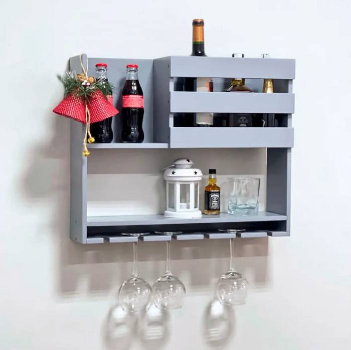The minimalist and Scandinavian-style shelf features glass holders, space for a bottle, vase/book and decor. A great option for a home mini-bar, a shelf for storing glasses and decor, this shelf will be a cool addition to any kitchen or living room.