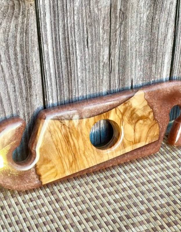 Rose Gold/Peach Epoxy Resin Olive Wood Handmade/Handcrafted Wine Caddy/Wine Bottle and Glass Holder